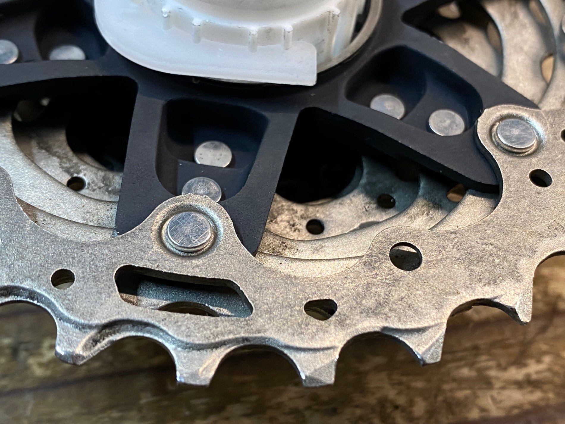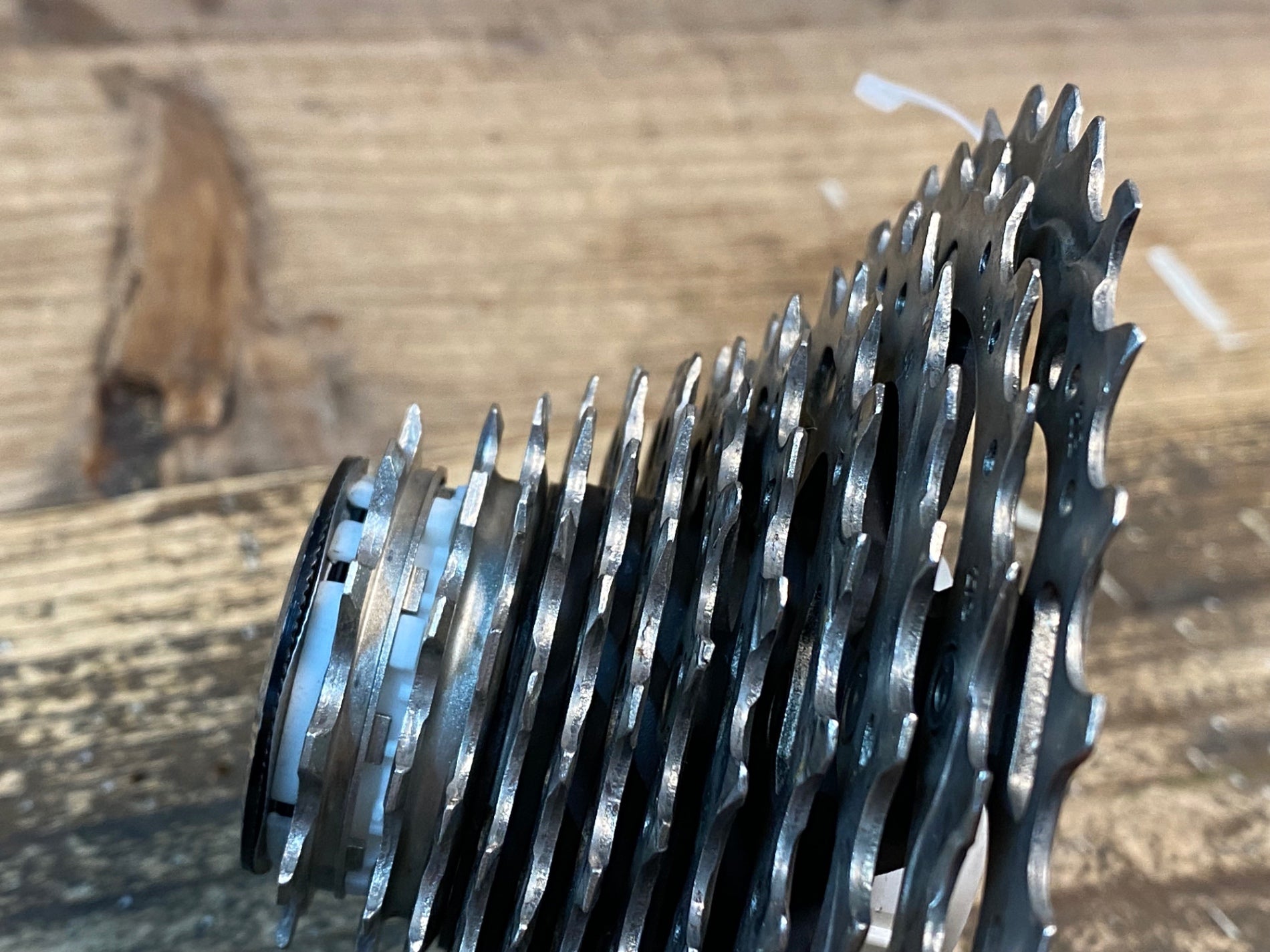 ロックリングのガリ傷、歯の摩耗、チェーン跡が強く見受けられます。
